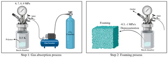 To ensure the stable production of the MCP, a solid-state batch foaming process was used. The MCP is carried out in two steps, as shown in Figure 2: the gas absorption process and the foaming process. This involved placing the polymer in a chamber, increasing the pressure up to 6~9 MPa using a gas booster (GB-SS, Pumster, Daejeon, Republic of Korea), and heating the batch chamber to 313 K with a band heater to create a scCO2 state. The polymer was then saturated with gas under these conditions. To investigate the interaction between CO2 and the solid-state polymer, gas absorption was conducted at 313 K, a temperature below the melting point of PCL (333 K). Figure 2 provides a schematic overview of the MCP using a batch chamber system. Considering that the Tg of PCL is around 213 K, microcellular foam forms inside the chamber during depressurization [,,]. The depressurization rate was controlled by adjusting the opening of the outlet valve to achieve the desired rate. Two ball valves were utilized to regulate the depressurization process. One valve was partially opened to enable controlled pressure release, while the other was fully opened to expedite the process. The time required for the pressure to reach atmospheric levels was carefully measured, allowing for the consistent achievement of a depressurization rate of −0.3 and −1 MPa/s. This approach provided precise control over the depressurization process, ensuring the repeatability and reliability of the experimental conditions. More detailed MCP conditions are provided in Table 1.