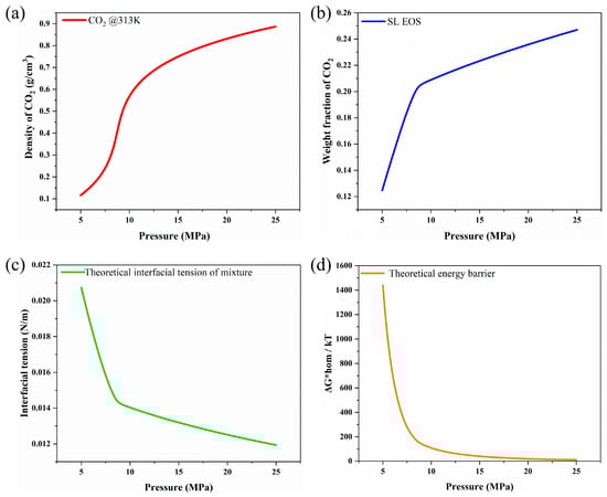 The density of CO2 was predicted using the PRSV-EOS, as outlined in Equations (1)–(7). The parameters necessary for the PRSV-EOS are summarized in Table 2. Using these parameters, the density of CO2 at 313 K can be computed as a function of pressure. This enables accurate predictions of CO2 density across all temperatures and pressures in both subcritical and supercritical states.