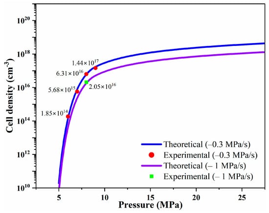 Theoretical cell density at 313 K predicted by SL-EOS and CNT, compared with experimentally measured cell density at 6, 7, 8, and 9 MPa, 313 K, −0.3, MPa/s and 8 MPa, 313 K, −1 MPa/s.