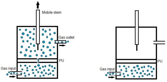 Quantitative evaluation of self-healing. The self-healing at 20 °C of the PUs was determined by using the equipment described in a previous study []. Cylindrical PU pieces (dimensions: diameter = 19 mm; thickness = 3 mm) were hermetically placed inside a thermostatic chamber. Each PU piece was fully pierced with a needle of diameter 1 mm, and, upon removing the needle, a continuous flow of nitrogen gas at a pressure of 750 mbar and a flow rate of 8 mL/min was allowed to flow from the bottom to the top of the closed chamber (Figure 1). The gas flow was continuously monitored over time until it ceased (Figure 1), allowing the determination of the self-healing time and the kinetics of self-healing of the PUs.