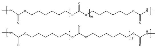 The PUs were synthesized by reacting 4,4′ methylene bis(cyclohexyl) isocyanate (HMDI) (90% purity, Sigma Aldrich Co., St. Luis, MO, USA) with polycarbonates of 1,6-hexanediol polyols of molecular weights 500 (CD500), 1000 (CD1000), and 2000 Da (CD2000) (UBE Chemical Europe S.A., Castellón, Spain). The prepolymer obtained was reacted with 1,4-butanediol (BD) chain extender (99% purity, Panreac Applichem®, Darmstadt, Germany).