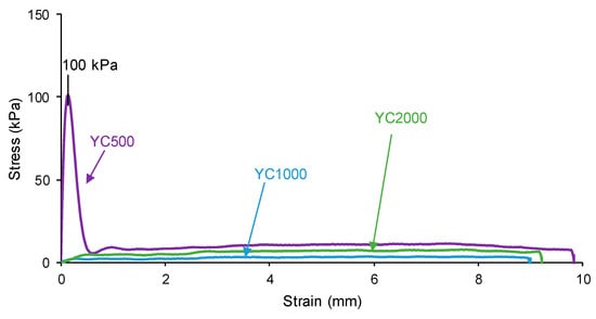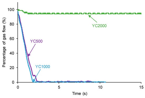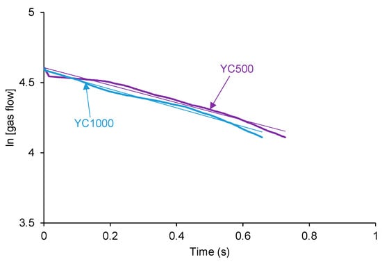 Figure 4 shows that the plots of ln[gas flow] vs. time adjust reasonably the kinetics of self-healing of YC500 and YC1000 to a first order (R2 = 0.97–0.98). The rate constant of YC500 is 0.62, and the one of YC1000 is 0.67. Therefore, the kinetics of self-healing are somewhat similar but slightly higher in YC1000.