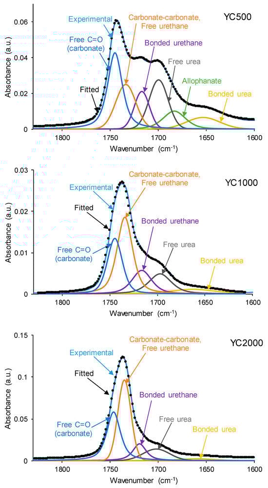 The different C=O species in the PUs were assessed by curve fitting (a Gaussian function was used) of the carbonyl stretching bands in the ATR-IR spectra (Figure 9). All PUs show the existence of five different C=O species (Table 5) and, additionally, only YC500 exhibits allophanate groups at 1685 cm−1 []. The allophanate groups are produced by the reaction of urethane and isocyanate and only appear in YC500 because of the short polyol chain. The existence of allophanate groups inhibits the segmental motion of the polymer chains, and this can be associated with longer self-healing time in YC500. All PUs have 24–34% free carbonate groups at 1742–1746 cm−1 [], and YC1000 has the lowest percentage. Furthermore, the curve fitting of all PUs shows free urethane and dipole carbonate–carbonate interactions at 1732–1733 cm−1 [,], and its percentage increases from YC500 to YC1000. The hydrogen-bonded urethane species appear at 1713–1722 cm−1, and its percentage is somewhat similar in all PUs. Additionally, the free and hydrogen-bonded urea groups appear at 1695–1697 and 1650–1654 cm−1, respectively [], and their percentages decrease by increasing the molecular weight of the polycarbonate. Therefore, YC500 shows a significant percentage of free carbonate and free and hydrogen-bonded urea groups, a low percentage of urethane groups, and is the only one having allophanate species (Table 5). On the other hand, YC1000 shows a low percentage of free carbonate and significant percentages of free urethane/dipole carbonate–carbonate interactions and bonded urea species (Table 5). Considering the different C=O species, YC500 shows allophanate species that increase the interactions between its polymeric chains, whereas YC1000 has a lower percentage of free carbonate and a higher percentage of dipole carbonate–carbonate interactions, and these different chemical species may contribute to the longer self-healing time of YC500 with respect to YC1000.