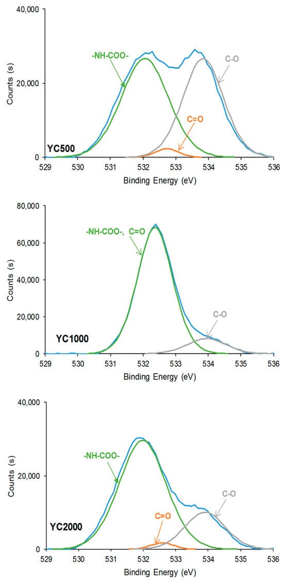 In general, the curve fittings of the high-resolution O1s photopeaks of the PU surfaces show three species: -NH-COO-, C=O, and C-O (Table 7). -NH-COO- species at binding energies of 531.9–532.1 eV (Figure 10) are dominant in all PUs. In fact, in a previous study, the binding energy of –NH-COO- of PU surfaces appeared at 530.8 eV []. However, the lower binding energy of the band in the O1s photopeak of YC1000 (532.4 eV) is intermediate between the one of -NH-COO- (531.9–532.1 eV) and C=O species (532.6–532.7 eV). Therefore, in YC1000, the –NH-COO- and C=O species are difficult to distinguish, likely due to its relatively low free C=O species and high dipole carbonate–carbonate interactions (they are evidenced by ATR-IR spectroscopy). In fact, YC1000 exhibits the highest percentage of –NH-COO-/C=O species and the lower one of C-O species (Table 7), and this is an indication of its different structure with respect to YC500 and YC2000. This agrees well with the results of the curve fitting of the carbonyl region of the ATR-IR spectra.