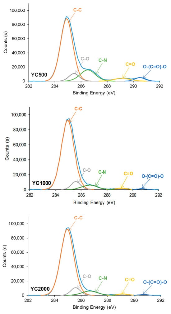 The curve fittings of the high resolution C1s photopeaks on PU surfaces show the existence of C-C (binding energy = 284.9 eV), C-O (binding energy = 285.6–285.7 eV), C-N (binding energy = 286.7–286.8 eV), C=O (binding energy = 289.1–289.4 eV), and O-(C=O)-O (binding energy = 290.7–290.8 eV) species (Figure 11, Table 8). This assignment was based on a previous study []. The increase in the molecular weight of the polycarbonate soft segments causes an increase in the percentage of C-C species and a decrease in the ones of C-N—because of the decrease in the hard segment content—and O-(C=O)-O species. The YC1000 surface shows a higher percentage of C-C and a lower percentage of C=O species than the other PUs, due to the existence of a lower percentage of free carbonate groups and a higher percentage of dipole carbonate–carbonate interactions. On the other hand, YC500 shows a significantly high C-N percentage, likely due to allophanate species [].