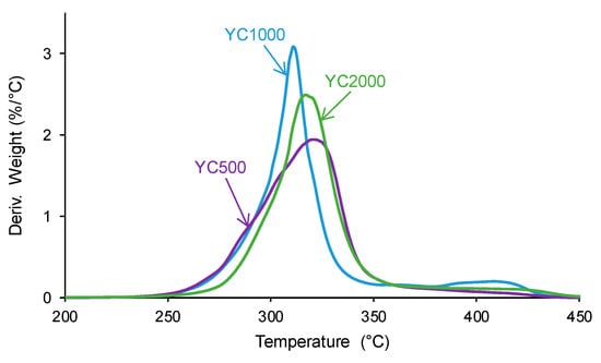 The structural differences between the PUs were also evidenced by TGA. The TGA curves of the PUs (Figure S2 of the Supplementary Materials file) show a different trend in YC1000 with respect to the other PUs. In fact, below 300 °C, similar TGA curves are obtained in YC500 and YC1000, and, above 340 °C, the TGA curve of YC1000 is above the others. The different thermal events can be better distinguished in the derivatives of the TGA curves. Figure 12 and Table 9 show that the lowest temperature of maximum thermal decomposition corresponds to YC1000. All PUs show three thermal decompositions at 285–292 °C (carbonate–carbonate interactions []), 311–321 °C (mixed phase due to carbonate–urethane interactions [,]), and 412–421 °C (hard segments). The DTGA curve of YC500 shows the lowest temperature of thermal degradation of the carbonate–carbonate interactions and the highest temperature and weight loss of the mixed phase, in agreement with the DSC results. The DTGA curve of YC1000 shows the lowest degradation temperatures of the mixed phase and hard segments, so the mixed phase due to carbonate–urethane interactions decomposes at a lower temperature than in YC500, i.e., the movement of the polymeric chains in YC1000 is more favored than in YC500. This can be associated with the higher time of self-healing in YC500. On the other hand, the DTGA curve of YC2000 shows the highest thermal degradation temperatures.