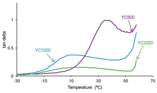 The tan delta vs. temperature plots of the PUs (Figure 14) show one structural relaxation only. YC500 shows the highest tan delta value and temperature of the structural relaxation, indicating a marked rheological viscous regime and, therefore, good polymeric chain mobility (Table 10). YC1000 shows an intermediate tan delta value and the lowest temperature of the structural relaxation, and the viscous rheological contribution is important. However, YC2000 shows a low tan delta value and dominant elastic rheological regime that supports the absence of self-healing.