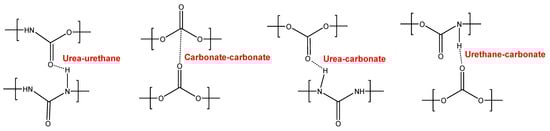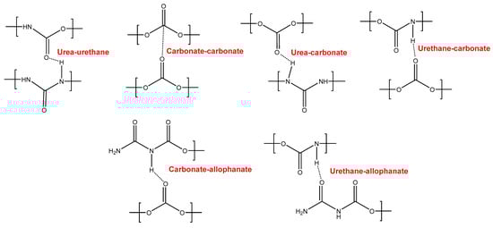 YC500 exhibits a rapid self-healing at 20 °C that can be ascribed to the existence of short chains (low molecular weight, short soft segments—three carbonate of 1,6-hexanediol units and five carbonate groups) and the important hydrogen bonds among the hard segments and between urethane/urea and carbonate groups in the soft segments. However, the self-healing time is longer than in YC1000 due to the existence of tack and the high HS content in YC500, both of which reduce the mobility of the polymeric chains. Furthermore, YC500 has a high polydispersity index, so there are short polymeric chains that favor the crack closure during self-healing and also long polymer chains that should displace slowly; therefore, the formation of an ordered structure among polymer chains of different lengths would be more difficult and the interactions between the carbonate groups would be less net. On the other hand, YC500 shows a low micro-phase separation, high heat capacity at constant pressure in the glass transition of the soft segments, and lack of crystallinity. Furthermore, YC500 has allophanate species, a low percentage of carbonate–carbonate interactions, a high amount of free urethane, and free and bonded ureas, and this disfavors the interactions between the soft segments and delays the self-healing at 20 °C. Because of a significant number of free carbonate species and short polycarbonate soft segments in YC500, the formation of urea–urethane and carbonate–carbonate interactions and different hydrogen bonds (urethane–carbonate, urea–carbonate, carbonate–allophanate, and urethane–allophanate) can be expected (Figure 16), and these interactions are responsible for the high decomposition temperature of the mixed phase in the TGA experiment and the high storage moduli in the DMA experiment.