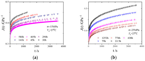 (a) Creep compliance of PMMA at 15 MPa. (b) Creep compliance of PMMA at 25 MPa.