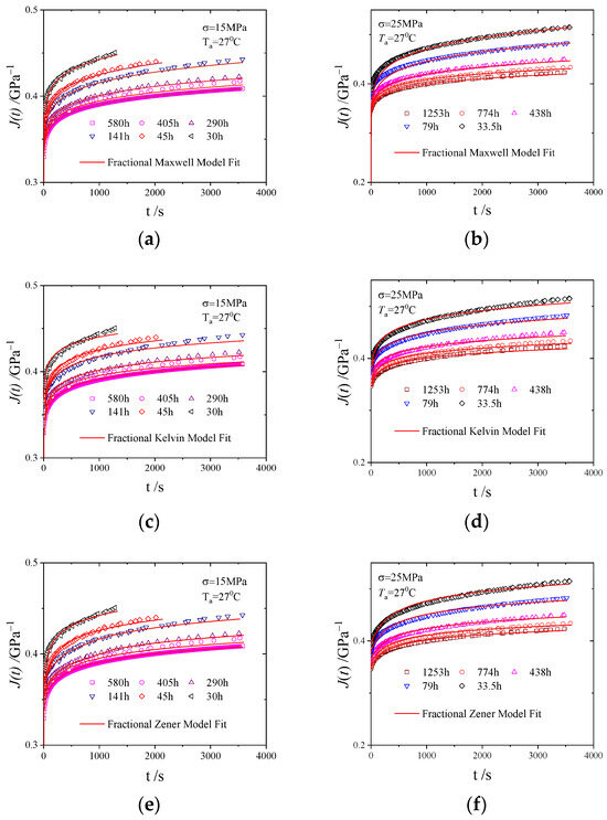(a) Fractional differential Maxwell model at 15 MPa. (b) Fractional differential Maxwell model at 25 MPa. (c) Fractional differential Kelvin model at 15 MPa. (d) Fractional differential Kelvin model at 25 MPa. (e) Fractional differential Zener model at 15 MPa. (f) Fractional differential Zener model at 25 MPa.
