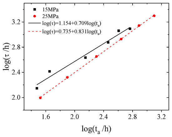 Thermorheologically simple materials only have a glass transition, which is also known as the main transition. The time required for this transition is the relaxation time of the material, which has a power law relationship with the physical ageing time. Plotting the relaxation and physical ageing times from Table 3 in a double-logarithmic coordinate system, as shown in Figure 7, reveals a good linear relationship.