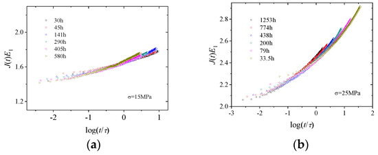 The time–ageing time equivalence principle suggests that creep compliance curves at different ageing times can be superimposed onto a master curve after horizontal shifting by an ageing shift factor. If the relaxation time is used as the time scale and the creep compliance is normalised by multiplying it by a parameter, then the curves at different ageing times can also be superimposed onto a master curve by vertical shifting, as shown in Figure 8 for 15 and 25 MPa.