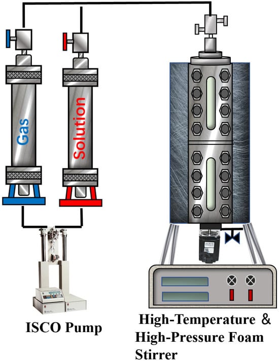 The high-temperature and high-pressure foam meter is a pressure-resistant vessel equipped with a viewing window and graduated scale. At the start of each experiment, 100 mL of prepared foaming solution is added to the foam meter. After evacuating the stirrer, the prepared gas is injected, and the temperature and pressure of the high-temperature, high-pressure chamber are adjusted. Considering the significant difference in solubility between CO2 and N2 in the solution, to minimize the impact of mass transfer in a non-equilibrium state on the experimental results, the gas and solution are stirred at a low speed for more than 0.5 h until the temperature and pressure stabilize, forming a balanced fluid. Subsequently, the balanced fluid is stirred at a high speed of 1000 r/min for 10 min. The foam volume (V) is obtained through the viewing window, and the time required for the foam volume to reduce by half (T1/2) is recorded to evaluate foam stability. Each set of samples is measured three times, and the average value of the experimental data is taken. The experimental procedure is shown in Figure 1.