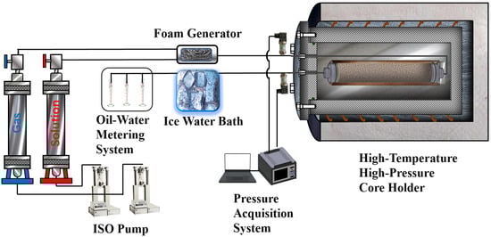 The Berea core was placed inside a copper sleeve within the core holder, with pipelines connected at both ends. The copper sleeve was positioned in the high-temperature, high-pressure chamber, and a confining pressure of 10–20 MPa was applied to the annulus of the chamber to ensure the copper sleeve was securely pressed against the core surface. The high-temperature, high-pressure chamber was then placed in an electric heating furnace, where the temperature and confining pressure of the apparatus were adjusted. The back pressure was set higher than the steam saturation pressure at the current temperature. A pre-determined volume (1 PV) of surfactant solution was injected into the core to achieve saturation adsorption on the core surface. The pressure differential across the sand-packed tube, Δp1, was recorded after the solution injection. Subsequently, both the surfactant solution and high-pressure gas were simultaneously injected into the core, with the solution injection rate set at 1 mL/min and the foam mass fraction at 60%. The pressure differential across the core, Δp2, was recorded. The experimental procedure is illustrated in Figure 2. The foam resistance factor can be calculated using Equation (3):