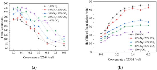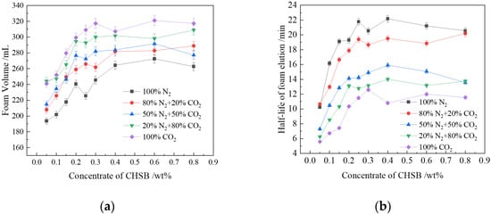 The addition of the Z364 polymer reduced the foaming volume of CHSB foam. When the polymer concentration exceeded 0.2%, the foam volume decreased significantly. The increase in solution viscosity due to the polymer addition required more energy to disperse the gas phase into the liquid phase to generate foam, but the stirring speed of the experimental apparatus was relatively low, providing limited energy [19,20,41]. As shown in Figure 4a, the higher the CO2 concentration in the gas, the larger the foam volume. The volume of pure CO2 foam is 30–35% greater than that of pure N2 foam. As the polymer concentration increases, the foam volume produced by various gases decreases, but the decrease is less pronounced for gases with higher CO2 concentrations. With higher polymer concentrations, the gas-water interfacial tension of CO2 decreases, making foam generation easier. During the preparation of the experiment, CO2 dissolves fully in the solution, and foam forms when CO2 is released during stirring [25,58]. The foam formed in this process becomes more stable as the solution viscosity increases.