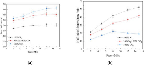 Figure 5a illustrates the relationship between foam volume and pressure. Within the pressure range of 2–15 Mpa, the foam volume increases with rising gas pressure, with this effect being more pronounced at lower pressures. As the density of gas molecules within the bubbles increases, the compressive effect on the surfactant molecules at the gas–liquid interface intensifies [50]. The polar parts of CHSB surfactant molecules tend to align towards the liquid phase, while the hydrophobic parts orient towards the gas phase. Under high pressure, this arrangement becomes more compact, reducing the interfacial free energy and consequently lowering the surface tension, ultimately leading to an increase in foam volume [62].