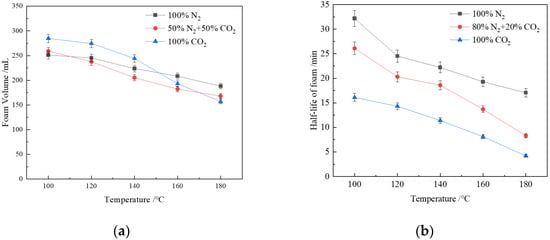Temperature resistance of CHSB foam with different gases: (a) foam volume; (b) foam volume half-life (6 MPa, 0.4% CHSB concentration, salinity: 50,000 mg/L).