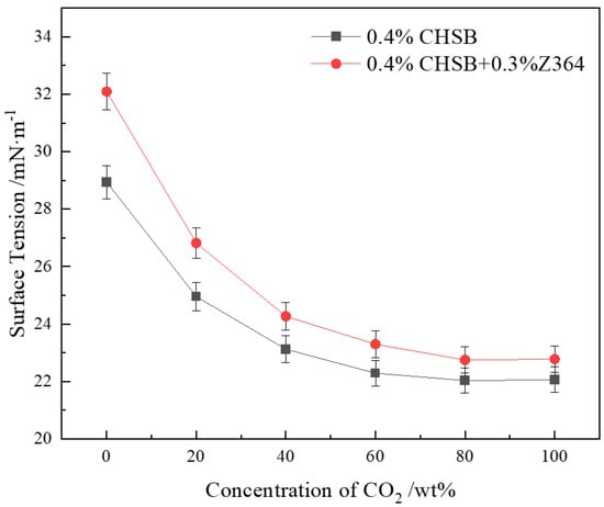 CO2 has a higher solubility in the solution compared to N2. As the concentration of CO2 increases, more CO2 molecules adsorb at the interface between the surfactant and the gas, leading to a reduction in interfacial tension [72]. As shown in Figure 7, the interfacial tension tends to decrease with increasing CO2 concentration. The mixed gas of N2 and CO2 exhibits certain non-ideal behavior, where their effects at the interface do not simply add up proportionally. The CO2 molecules at the gas–liquid interface gradually approach saturation [50]. Once the interface approaches saturation, further increases in CO2 concentration have a diminishing effect on interfacial tension, causing the changes in tension to level off [70].
