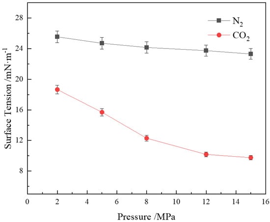 Figure 8 shows that the interfacial tension of the CHSB solution in CO2 and N2 gases decreases with increasing pressure. According to Henry’s law, the solubility of a gas is directly proportional to pressure [8]. Due to the non-polar nature and low solubility of N2, its dissolution in water is relatively limited, making the reduction in interfacial tension less pronounced as pressure increases. In contrast, the solubility of CO2 in water increases significantly under pressure. This high solubility allows CO2 molecules to form a dense adsorption layer at the gas–liquid interface, markedly reducing the interfacial free energy and, consequently, the interfacial tension [70]. Under high pressure, the dissolved CO2 molecules can more effectively rearrange and enhance interface adsorption, further reducing the interfacial tension. Additionally, the dissolution of CO2 under high pressure increases the acidity of the solution, leading to the protonation of the carboxylic acid groups in the CHSB surfactant [12,49,74]. This protonation effect reduces the polarity and intermolecular electrostatic repulsion of CHSB molecules, allowing more surfactant molecules to adsorb at the gas–liquid interface, thereby further decreasing the interfacial tension.