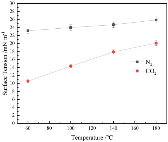 The experimental results indicate significant differences in the foaming ability and foam stability of the surfactant solution in gases with different CO2 concentrations. The volume of pure CO2 foam ranges from 241 to 317 mL, while the volume of pure N2 foam ranges from 193 to 262 mL, showing a decrease of approximately 18–20% in N2 foam volume compared to CO2 foam. In a pure CO2 gas environment, the surfactant’s foaming ability is superior to that under pure N2 conditions [46]. When the gas is a mixture, the foaming ability of the surfactant increases with CO2 concentration. Subsequent experiments confirmed that this phenomenon is related to the gas–liquid interfacial tension [47]. The interfacial tension between CO2 and water is much lower than that between N2 and water [48,49], as a lower interfacial tension requires less energy for foam generation [50].