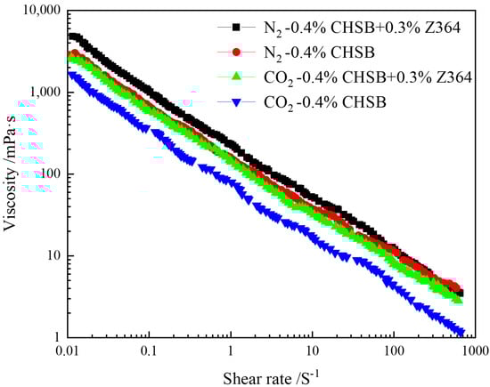The shear viscosity of polymer-enhanced foam also increases significantly with the polymer concentration. Low concentrations of the polymer not only enhance the viscosity of the liquid film but also substantially improve the viscoelasticity of the gas-liquid interface. On a macroscopic level, this manifests as a more pronounced increase in foam viscosity under shear stress compared to the polymer-surfactant solution alone. Figure 10 shows that the viscosity of N2 foam is higher than that of CO2 foam, which can be attributed to the higher solubility of CO2 in the surfactant solution [77], while N2 foam exhibits a greater stability and higher liquid film viscoelasticity [61]. In porous media, the combination of low solution viscosity and high apparent foam viscosity helps improve the effectiveness of foam in blocking high-permeability channels. Reducing the proportion of CO2 in CO2 foam and adding an appropriate amount of N2 can enhance the potential application of foam in enhanced oil recovery (EOR) practices.