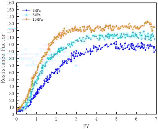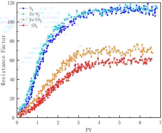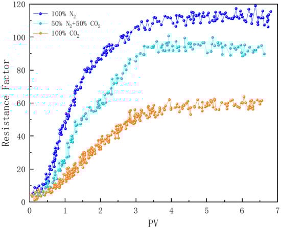 In Figure 12, core samples numbered 2, 3, and 4 demonstrate the effect of CO2 concentration in the gas phase on foam plugging performance. Under a back pressure of 6 MPa, the resistance factor of N2 foam reaches 115, which is 2.1 times higher than that of pure CO2 foam. Previous studies have shown that N2 foam exhibits a greater stability compared to CO2 foam; therefore, in porous media, N2 foam can more effectively penetrate deeper into the core and enhance the flow resistance to a greater extent [78]. Additional research indicates that, when the foam quality is below 90%, the flow resistance of the foam increases with rising foam quality [26]. Under identical injected foam quality conditions, due to the lower solubility of N2 in water, N2 foam maintains a higher foam quality during flow compared to CO2 foam. When the proportion of CO2 gas is reduced to 50%, the resistance factor curve of the foam closely resembles that of pure N2 foam. Polymer-enhanced foam (PEF) effectively counteracts the negative impact of CO2 dissolution on liquid film stability. The addition of N2 not only improves foam stability but also increases the actual gas proportion—i.e., foam quality—within the flowing foam in the core samples.