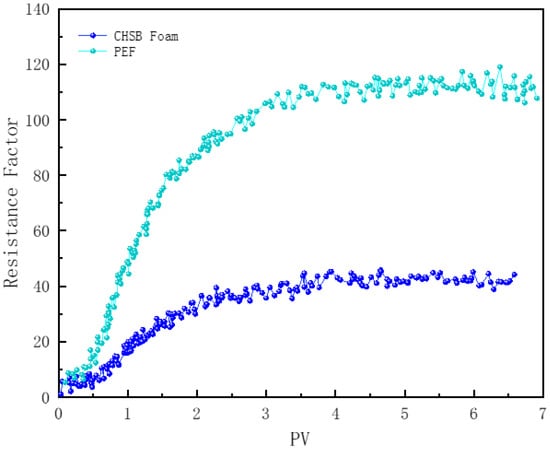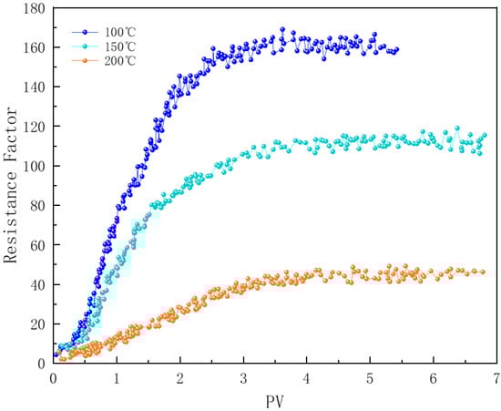 In Figure 13, core samples numbered 1, 2, and 6 illustrate the impact of temperature on foam flow within the cores. Temperature is one of the most critical factors affecting the structural stability of surfactants and their adsorption characteristics at the gas-liquid interface [37]. As the fluid temperature in the reservoir increases, particularly near the edges of the steam chamber, the effectiveness of foam plugging varies. The polymer-enhanced foam (PEF) exhibits good plugging performance at 100 °C, with a resistance factor reaching 150–160. However, as the temperature rises to 150 °C, the strength of the liquid film decreases, causing the resistance factor to drop to around 110. When the temperature further increases to 200 °C, the stability of the PEF foam is significantly compromised, with the resistance factor falling below 40. Excessive temperatures weaken both the activity of the surfactant and the viscosity-enhancing effect of the polymer, making bubbles more prone to rupturing and coalescing during flow [37]. At 200 °C, stable foam flow is only achieved after approximately 4 pore volumes (PVs) of foam fluid have been injected.