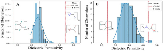 Data visualization through histograms is a fundamental step in quantitative data analysis [54]. In this study, histograms were used to illustrate the distribution of dielectric permittivity in the dataset. Figure 1A shows the original dataset of 86 polymers. The X-axis represents dielectric permittivity values, while the Y-axis shows the frequency of each value or range. The taller the bar in the histogram, the more frequently those values appear in the dataset [55]. Additionally, the blue lines represent density curves generated using Kernel Density Estimation (KDE), which provide a smooth and continuous view of the data distribution. These curves help highlight concentrations and central trends in the data [56]. In addition, Figure 1 reveals that most data points cluster around the center, with fewer at the extremes, showing a right-skewed distribution [51]. The mean value (3.148) serves as the central point, with a lower limit of −0.546 and an upper limit of 6.844, calculated by subtracting and adding three times the standard deviation (1.232), respectively. Data points beyond these limits were flagged as outliers, including Fumaronitrile (8.5), Vinyl Fluoride (8.5), Vinylidene Fluoride (8.4), and Methylcellulose (6.8). After this step, the dataset was reduced to 82 points. The updated graph (Figure 1B) shows a significant improvement in the accuracy and reliability of the data analysis, ensuring a more precise representation of the dataset and achieving a normal distribution.