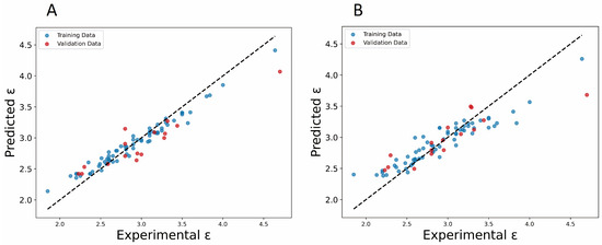 Plots of experimental vs. predicted values of the dielectric constant for (A) GBR_A and (B) GBR_B models.