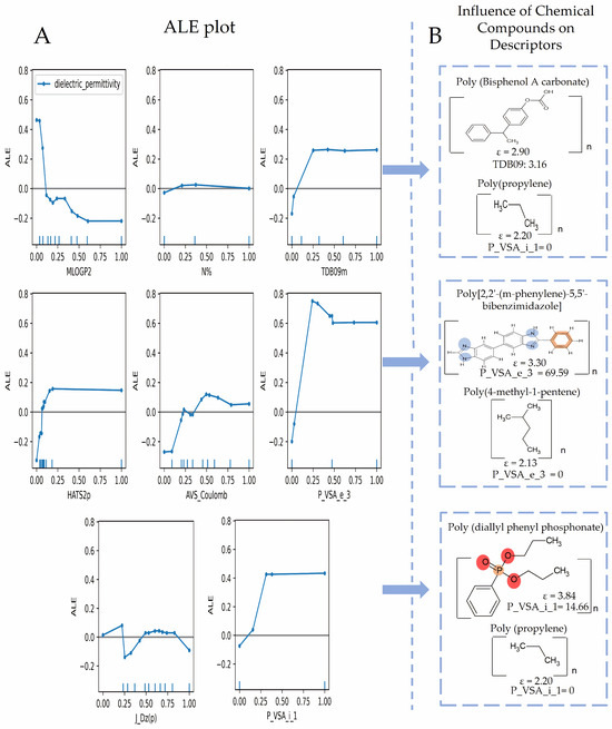 (A) Accumulated Local Effect (ALE) plots for the descriptors in the GB_A model, illustrating the influence of each descriptor on the prediction of dielectric permittivity. (B) Chemical compounds highlighting the positive or negative impact on the descriptors.
