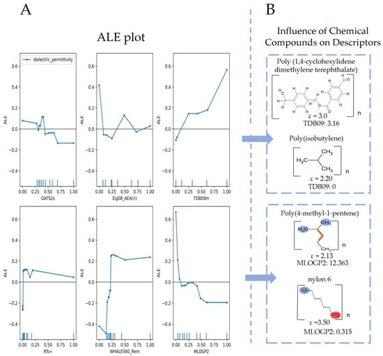 Also, in this study the Accumulated Local Effect (ALE) approach was used to facilitate the visualization of the individual impact of each descriptor on dielectric permittivity predictions. ALE graphs serve as effective tools for both visualizing and quantifying the individual influence of each input on prediction [33]. Although, several interpretative methods exist, such as Partial Dependence Plots (PDP) and Individual Conditional Expectation (ICE) curves, which have been used in various studies [34,35,36,37]. ALE plots offer more precise interpretations in complex models. The ALE plots do so by mitigating inaccuracies caused by the aggregation of heterogeneous effects and incorrect assumptions of feature independence [34,37]. Moreover, ALE plots allow for the identification of precise local effects within the data, thereby improving the understanding of variable interactions—something that ICE curves and PDPs are less effective at achieving. Additionally, ALE plots are more computationally efficient, overcoming the limitations of PDPs in high-complexity scenarios [36].