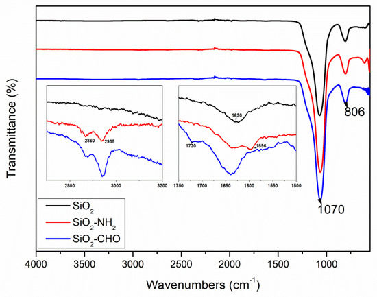 Figure 1 displays the FTIR spectra of the silica nanoparticles before and after modification. All samples exhibited strong stretching vibrations of the Si-O-Si bond at around 1070 cm−1 and Si-O bending vibrations at 806 cm−1 [45,46]. Peaks near 1630 cm−1 were assigned to stretching vibrations of the surface silanol groups in the silica matrix. Following the introduction of amino functionality, SiO2-NH2 displayed characteristic peaks of the N-H bending vibration at 1596 cm−1. Compared to SiO2-NH2, the spectrum of SiO2-CHO showed the complete disappearance of the N-H band at 1596 cm−1 since we used an excess of glutaraldehyde. A new band also appeared at 1720 cm−1 due to the C=O bond from the aldehyde group. In the spectra of SiO2-NH2 and SiO2-CHO, new peaks emerged near 2860 and 2935 cm−1, attributed to C-H absorption. These peaks indicate the successful completion of each grafting step and the successful grafting of aldehydes onto the surface of the silica. Additionally, it was observed that the SiO2-CHO nanoparticles exhibited a pink coloration.