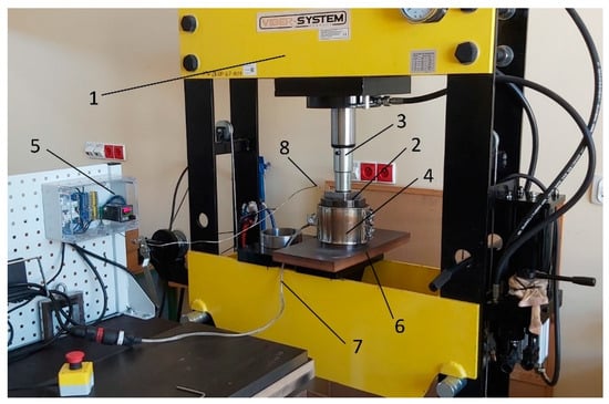 Laboratory stand for sample production: 1—hydraulic press, 2—form, 3—press piston rod, 4—band heating system, 5—temperature regulation system, 6—insulating plate, 7—power cord, 8—thermocouple.