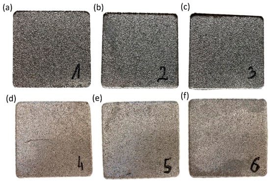 Samples produced with the following composition proportions: (a) PA5%/Al.95%, filler fraction 0.4–0.8 mm, (b) PA10%/Al.90%, filler fraction 0.4–0.8 mm, (c) PA15%/Al.85%, filler fraction 0.4–0.8 mm, (d) PA5%/Al.95%, filler fraction 0.8–1.2 mm, (e) PA10%/Al.80%, filler fraction 0.8–1.2 mm, (f) PA15%/Al.85%, filler fraction 0.8–1.2 mm.