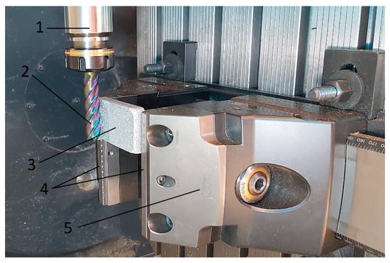 Composite machining process: 1—tool handle, 2—tool, 3—machined sample, 4—mounting jaws, 5—dedicated 5 axis vice.