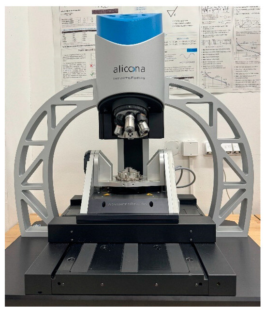 The surfaces of the machined samples were analyzed using an Alicona Infinite Focus optical microscope (Alicona Imaging GmbH, Raaba, Austria)—Figure 4. The measurement system operates on the principle of changing focus, using a surface scanning methodology that integrates the shallow depth of field of the optical system with vertical scanning, extracting topographic details in different focal planes. The method uses adjustable, white, concentric illumination directed at the sample. The sample surface reflects light rays, and their reflection is recorded by a sensor placed in the optical part of the microscope. Manipulating the sensor along the Z-axis changes the distance from the measured surface, thus adjusting the focal planes.