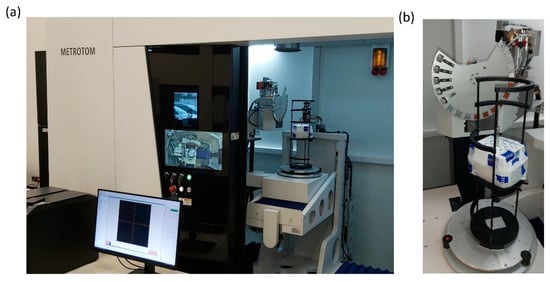 Computed tomography examinations are a type of X-ray spectroscopy, thanks to which tomographic images of the examined object are obtained, and then, thanks to the use of computer techniques for processing digital images, a spatial model (3D) is presented from many flat shots (2D) taken in different positions [36]. Tomographic images contain information about the position and absorbing features in the object and can be used for further reconstruction of spatial data. Any defects inside the object or changes in its density or porosity can be imaged and measured. The examination consists in directing an X-ray beam at the examined object and recording its intensity on the other side on the detector. X-ray radiation, similarly to electromagnetic radiation, is absorbed and scattered by the examined material depending on its properties. As a result of the material’s own absorption, the radiation beam is weakened. The weakening is closely related to the function of the radiation energy and the type and thickness of the examined material. The change in the radiation intensity of parallel beams of equal energy when passing through an object can be precisely defined by assigning specific features to particular types of material volumes. The study was performed using a Metrotom 1500 G3 computer tomograph (Carl Zeiss In-dustrielle Messtechnik GmbH, Oberkochen, Germany). The device is equipped with an advanced closed-type, water-cooled X-ray tube with a voltage range from 30 to 225 kV, which allows for the penetration of materials with higher density. The maximum power consumption of the tube is 500 W, which translates into higher efficiency and scanning speed—Figure 5. The detection system is based on an advanced high-resolution detector matrix, placed at a distance of up to 1500 mm from the X-ray source, which allows for obtaining detailed images with high precision. The size of a single pixel is 139 × 139 μm, which ensures exceptional image quality and measurement accuracy.