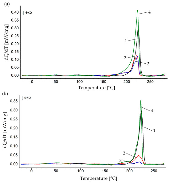 DSC thermograms of the tested materials: 1—PA6, 2—PA6 + 95% Al, 3—PA6 + 90% Al, 4—PA6 + 85%; (a) AL 0.4–0.8 mm, (b) AL 0.8–1.2 mm.