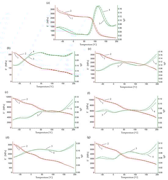 The dependence of the conservative modulus and the tangent of the mechanical loss angle on the temperature at a frequency of 1 Hz-1, 3, at a frequency of 10 Hz-2, 4: (a) PA 6, (b) PA6, 95% Al 0.4–0.8 mm, (c) PA6, 90% Al 0.4–0.8 mm, (d) PA6, 85% Al 0.4–0.8 mm, (e) PA6, 95% Al 0.8–1.2 mm, (f) PA6, 90% Al 0.8–1.2 mm, (g) PA6, 85% Al 0.8–1.2 mm.
