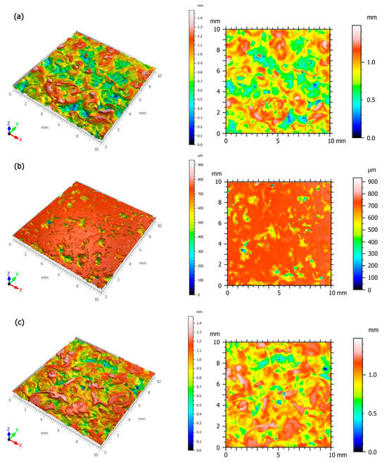 The study was conducted in accordance with the ISO 25178 [35] standard, determining, among others, roughness amplitude parameters (Sq—root mean square height, Sp—maximum peak height, Sv—maximum pit height, Sa—arithmetic mean height, Sz—maximum profile height, Sku—kutrose) and functional parameters (Vmc—core volume, Vvc—maximum pit volume, Vmp—peak volume, Vvv—percentage functional volume). Surface amplitude parameters describe the surface roughness profile, i.e., deviations of the actual surface from the ideally smooth one. These parameters provide important information on the surface structure, which is crucial in processes such as friction, wear or adhesion. In the analysis of surface structure, especially in the context of tribology and material technology, the evaluation of functional parameters Vmc, Vvc, Vmp and Vvv plays a key role in understanding the surface properties. These parameters allow for the evaluation of the surface characteristics in terms of its potential applications and performance properties. The core volume (Vmc) is a volumetric parameter that refers to the volume of surface material located in the core region, i.e., the central part of the surface profile that does not contain extreme peaks or deep valleys. The Vmc parameter is a measure of the structural stability of the surface and a key indicator for assessing the durability of the surface in mechanical applications. A high Vmc value indicates a more stable and durable surface, which is desirable in components exposed to high loads. The volume of the valleys (Vvc) is a parameter that refers to the volume of space between the surface and the reference line in the valley areas of the surface profile. It is a measure of the amount of free space that can be used, for example, to store lubricants or other substances. A high Vvc value indicates the ability of the surface to store lubricant effectively, which can significantly reduce friction and wear of mechanical components. The volume of the peaks (Vmp) is a parameter that refers to the volume of surface material located above the reference line in the peak areas of the surface profile. The Vmp value is a measure of the presence of peaks on the surface, which can affect initial contact and interactions with other surfaces. A low Vmp value indicates a smooth surface with few peaks, which can lead to reduced wear at the beginning of service. The percentage of the functional volume (Vvv) is a parameter that refers to the percentage of the valley volume in the total surface volume. It is an indicator of the surface’s effectiveness in terms of its ability to perform functional functions, such as storing lubricant or removing contaminants. A high Vvv value suggests that the surface has a well-developed valley structure, which may improve its ability to retain lubricant and remove contaminants, and thus increase the durability and reliability of the surface in long-term service.