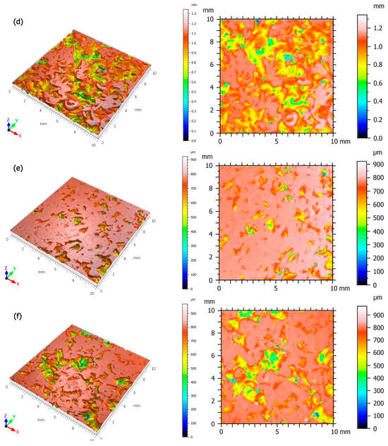 Stereometric visualization of the machined surfaces: (a) PA5%/Al.95%, filler fraction 0.4–0.8 mm, (b) PA10%/Al.90%, filler fraction 0.4–0.8 mm, (c) PA15%/Al.85%, filler fraction 0.4–0.8 mm, (d) PA5%/Al.95%, filler fraction 0.8–1.2 mm, (e) PA10%/Al.80%, filler fraction 0.8–1.2 mm, (f) PA15%/Al.85%, filler fraction 0.8–1.2 mm.