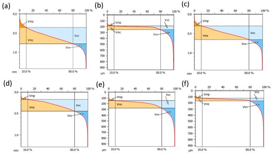 Graphic interpretation and volumetric parameters of machined composite surfaces: (a) PA5%/Al.95%, filler fraction 0.4–0.8 mm, (b) PA10%/Al.90%, filler fraction 0.4–0.8 mm, (c) PA15%/Al.85%, filler fraction 0.4–0.8 mm, (d) PA5%/Al.95%, filler fraction 0.8–1.2 mm, (e) PA10%/Al.80%, filler fraction 0.8–1.2 mm, (f) PA15%/Al.85%, filler fraction 0.8–1.2 mm.