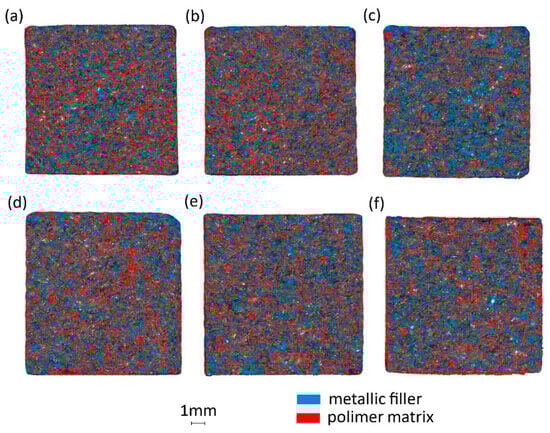 Cross-sectional images of samples in tomographic examination: (a) PA5%/Al.95%, filler fraction 0.4–0.8 mm, (b) PA10%/Al.90%, filler fraction 0.4–0.8 mm, (c) PA15%/Al.85%, filler fraction 0.4–0.8 mm, (d) PA5%/Al.95%, filler fraction 0.8–1.2 mm, (e) PA10%/Al.80%, filler fraction 0.8–1.2 mm, (f) PA15%/Al.85%, filler fraction 0.8–1.2 mm.
