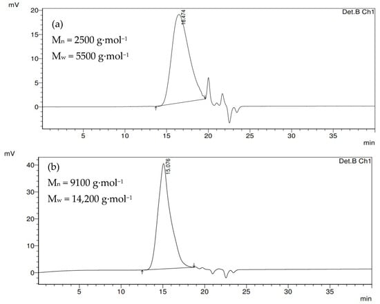 SEC chromatograms of PLLA precursor (a) and PLLA-b-PCL copolymer (DB2) (b).
