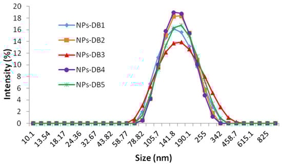 From Table 4, it can be observed, as a general remark, that all the NPs have sizes around 150 nm and low PDI values, generally under 0.01, which confirm their very narrow polydispersity. Moreover, it appears that, by increasing the molar mass of the copolymers, from DB1 to DB5, only a slight increase in the NPs’ sizes is observed, whereas no evident correlation can be noticed for PDI values. Comparing the NP sizes as a function of temperature, it seems that, by increasing the temperature from 25 to 37 °C, a very slight size decrease occurs that is, however, within the experimental error limits. As a function of the molar mass of the copolymers, a similar trend is seen at 37 °C for both Z-average and Dv values. The increase in the NP sizes as a function of the molar mass of the copolymers was also noticed by other authors [].