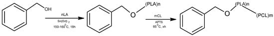 ε-caprolactone (ε-CL) (purity 99%), benzyl alcohol (99% purity), and toluene (purity ≥ 99.3%) purchased from Alfa Aesar (Haverhill, MA, USA) were dried and stored on a 3 Å molecular sieve under nitrogen. L-lactide (LA) (97% purity), purchased from Corbion (Amsterdam, Netherlands), was stored in a desiccator, under vacuum, and oven-dried (60 °C) at least 24 h before each use. Tin 2-ethylhexanoate (tin octoate, Sn(Oct)2, purity 92.5–100%), purchased from Sigma Aldrich (St. Louis, MO, USA), was used as received. Para-toluenesulfonic acid monohydrate (PTSA) from Sigma-Aldrich (St. Louis, MO, USA) (purity ≥ 98.5%) was stored in a drawer, under vacuum, to protect it from moisture. Poly(vinyl alcohol) (PVA) with Mw = 13,000–23,000 g·mol−1, hydrolysis degree of 87–89%, was purchased from Carlo Erba (Emmendingen, Germany).