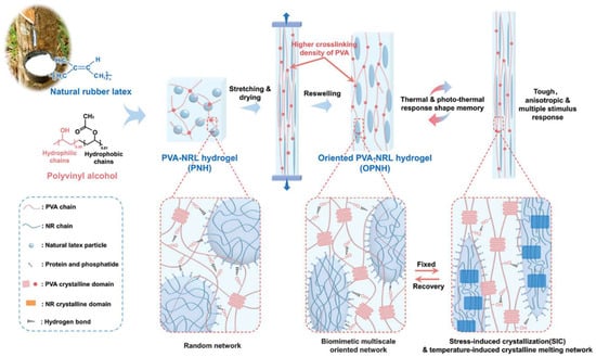 - Li, Z.; Li, Z.; Zhou, S.; Zhang, J.; Zong, L. Biomimetic Multiscale Oriented PVA/NRL Hydrogel Enabled Multistimulus Responsive and Smart Shape Memory Actuator. Small 2024, 20, 2311240. [Google Scholar] [CrossRef]