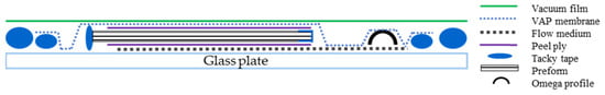 The VAP infusion is a variation of resin infusion, where a semipermeable membrane separates the vacuum outlet from the surface of the part. This creates a full vacuum gradient and continued degassing across the part surface, as opposed to only at the end-edge of the part in traditional resin infusion like, e.g., SCRIMP. VAP and SCRIMP are used for the production of wind turbine blades, boats, aircraft interiors, and prototype parts. The main advantages of the VAP process are that all part sizes up to very large components with low permeable preforms, like, e.g., unidirectional carbon fiber spar cabs (>100 m), are feasible with very high process stability and low void content [20]. The main drawback is the high cost of the VAP membrane, which is not needed for SCRIMP. The difference between VAP and SCRIMP is that within the SCRIMP process, the air removal is only done on discrete lines or points, whereas in VAP the removal takes place extensively over the whole area of the part. All mentioned processes are well established and deliver high-quality laminates with high fiber volume content and low void content [21]. They have in common that the vacuum system is an open system with a permanent connection to the surrounding environment since the vacuum pumps are always running during the process. A sealed system is used for the VCI process, which is the main physical difference compared to VAP and SCRIMP. Figure 1 shows the VAP infusion setup and the principle, which has been used within this study. They have in common that the air outtake is done over the whole surface of the preform.