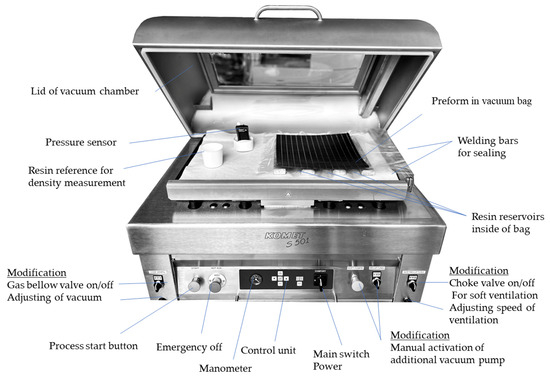 This study used a modified vacuum chamber sealing machine Komet S501 (Komet Maschinenfabrik GmbH, Plochingen, Germany), with a chamber dimension of 895 mm × 565 mm × 230 mm, for the infusion trials. The two welding bars have lengths of 740 mm and 455 mm. In Figure 2, the machine and the modifications are displayed, including the setup for the performed infiltrations of the sample plates. The machine includes two vacuum pumps for evacuation, one before the setup is sealed with a high flow rate and a second smaller one to adjust the vacuum inside the chamber after sealing if the chamber is not ventilated immediately.