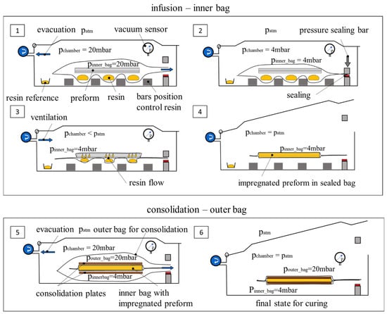 Scheme of the vacuum chamber infusion process. 1–4: Infusion with the inner bag. 5 and 6: Consolidation of the impregnated preform with an outer bag and 2 consolidation plates.